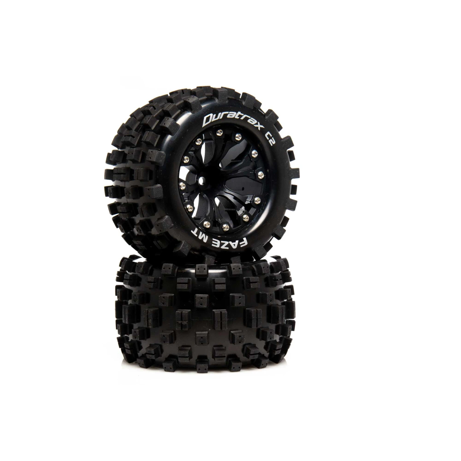 Factory-mounted with a .5 offset, these Duratrax® FAZE™ MT rear tires for 1/10 scale 2WD monster trucks feature a tread pattern that’s ideal for a wide variety of surfaces — pavement, hard-packed dry and wet tracks, grass, mud, and loose, dry and loamy surfaces. The wheels are molded from a durable black composite plastic with a 12mm hex and 2.7 inch (69.4mm) width. The tires are made from high-traction, C2 soft compound and are 4.9 inches (123.6mm) in diameter. Sold in pairs.