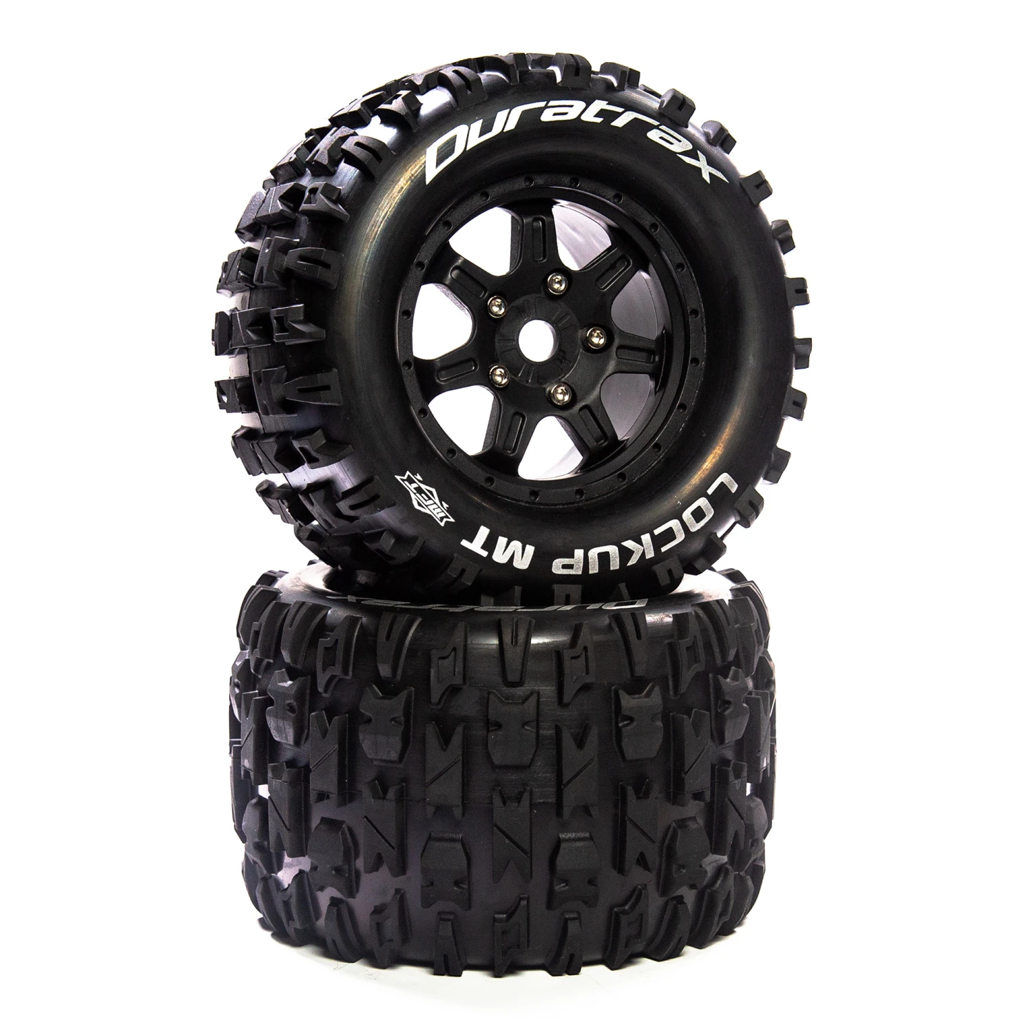 For running on pavement loose dry loamy dirt, loose wet mud, hard-packed wet or dry grass Duratrax offers these factory mounted 1/8 scale LOCKUP ST Belted front and rear tires for stadium trucks from ARRMA, HPI Racing and Traxxas. Molded from durable composite black plastic , the 17mm hex wheels measure 4.2 inches (105.5mm) wide and 6.7 inches (169.7mm) in diameter. The belted tires include one-piece foam inserts and are made from Medium Firm CS Sport Compound and are sold in pairs.