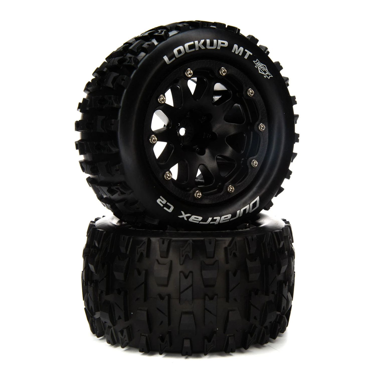 Factory-mounted, these Duratrax® LOCKUP™ MT front/rear tires for the 1/10 scale ARRMA® GRANITE™ 4X4 BLX Monster Truck feature a tread pattern that’s perfect for running on a wide range of surfaces — including asphalt, grass, and loose or hard-packed soil — and in wet or dry conditions. Molded from a durable black composite plastic, the 14mm hex wheels measure 2.8 inches (70.2mm) wide and 5.4 inches (136.9mm) in diameter. The belted tires include one-piece foam inserts and white sidewall markings, and are made from high-traction C2 soft compound. Sold in pairs.