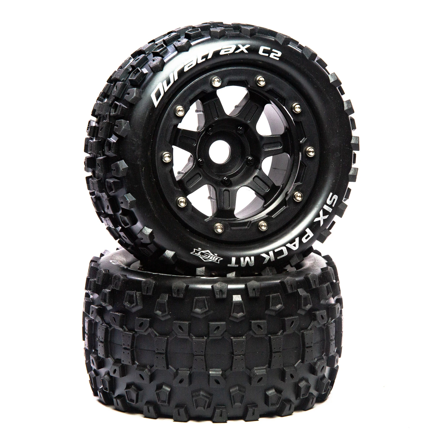 For running on a wide variety of surfaces: pavement, loose dry loamy dirt, loose wet mud, and hard-packed wet or dry grass Duratrax offers these factory mounted 1/10 scale SIX PACK MT Belted front/rear tires for the Traxxas MAXX and similar monster trucks. Molded from durable composite black plastic, the 17mm hex wheels measure 2.8 inches (70.2mm) wide and 5.4 inches (136.4mm) in diameter with a ½-inch wheel offset. The belted tires include one-piece foam inserts and are made from C2 Soft compound. Sold in pairs.
